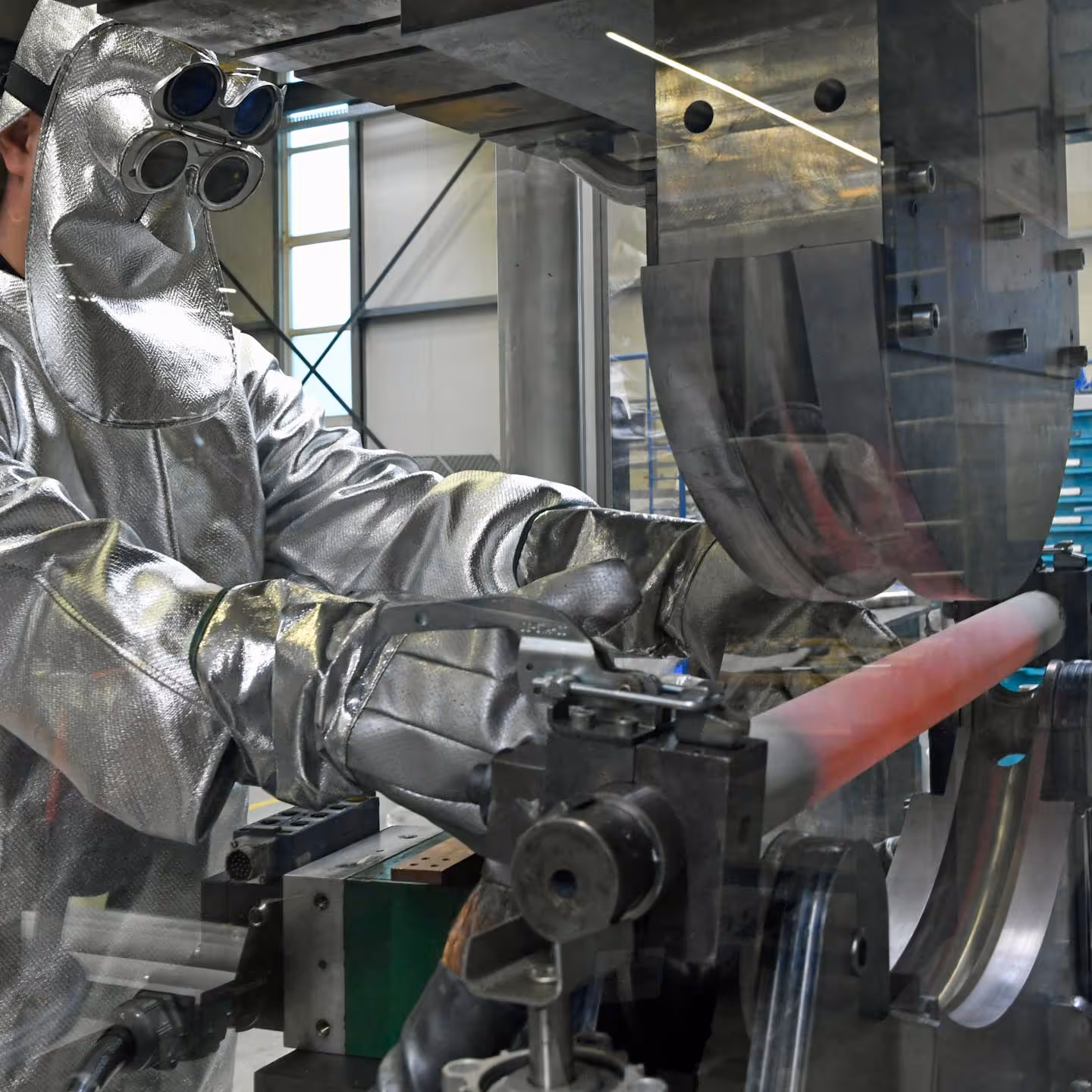 - Breites Technologieportfolio zur Realisierung von Kundenanforderungen wie Tiefziehen, Biegen von Blechen und Rohren, Gummipolsterumformung und Warmumformung für alle Arten von Materialien, einschließlich schwer verformbarer Materialien wie Titan